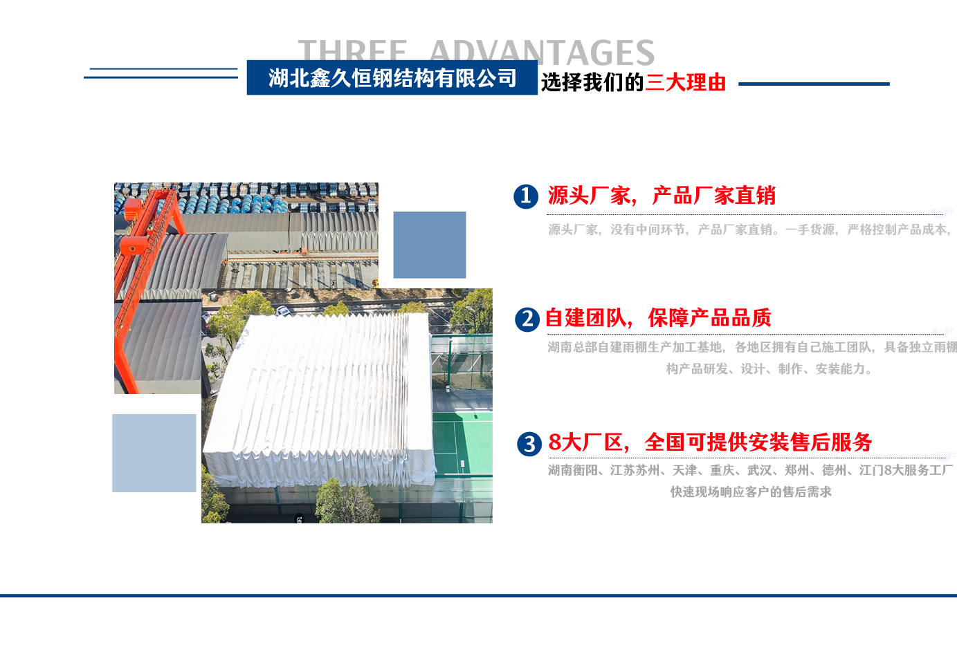 湖北鑫久恒鋼結(jié)構(gòu)有限公司是一家電動雨棚、膜結(jié)構(gòu)車棚研發(fā),生產(chǎn)銷售,施工安裝于一體的專業(yè)鋼結(jié)構(gòu)科技公司,主要產(chǎn)品有伸縮雨棚,電動雨棚,膜結(jié)構(gòu)車棚等。 湖南地區(qū)職員目前有80多人,占地面積20000平方米,廠房面積15600平方米,配備先進(jìn)的生產(chǎn)流水線,使每件品質(zhì)產(chǎn)品的堅(jiān)實(shí)基礎(chǔ)。 公司在蘇州、天津、重慶、武漢、德州、烏魯木齊、江門均設(shè)有服務(wù)工廠,總?cè)藛T共300多人,擁有專業(yè)的技術(shù)團(tuán)隊(duì),配備先進(jìn)的設(shè)備和流水線生產(chǎn),產(chǎn)能高,貨源充足,發(fā)貨速度快,服務(wù)區(qū)域廣。 移動伸縮棚適用于通道臨時倉儲、戶外運(yùn)動遮陽、污水池遮蓋、能源交通、熱力化工、礦山、船舶制造及市政建設(shè)、物流、碼頭等領(lǐng)域的構(gòu)件制作加工,成品半成品存放、倉庫、野外儀器設(shè)備操作用房等。尤其是對工廠發(fā)貨、倉儲臨時遮雨防嗮,梅雨期較長、建設(shè)周期較短的工程施工等特別適用。還可根據(jù)用戶需求量身定制、適合企業(yè)所需不同款式的產(chǎn)品。 我公司堅(jiān)持“誠信社會為本,客戶滿意為榮”的經(jīng)營理念,做到質(zhì)量把控,嚴(yán)格管理,精益求精,恪守承諾。使鑫久恒逐步走向成熟,其系統(tǒng)化、專業(yè)化日趨完善。以專業(yè)的技術(shù)、科學(xué)的管理,更高的產(chǎn)品質(zhì)量,優(yōu)良的企業(yè)信譽(yù),真誠的客戶服務(wù),靈活多樣的經(jīng)營方式和務(wù)實(shí)創(chuàng)新的企業(yè)精神愿與社會各界攜手合作,為推動智能鋼結(jié)構(gòu)建筑事業(yè)的發(fā)展而不斷努力。...